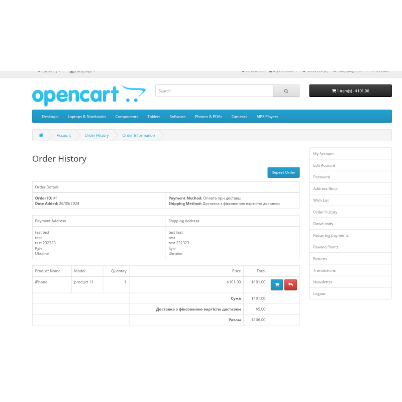 Модифікатор Повторне замовлення – Repeat Order (Order Again) для Opencart