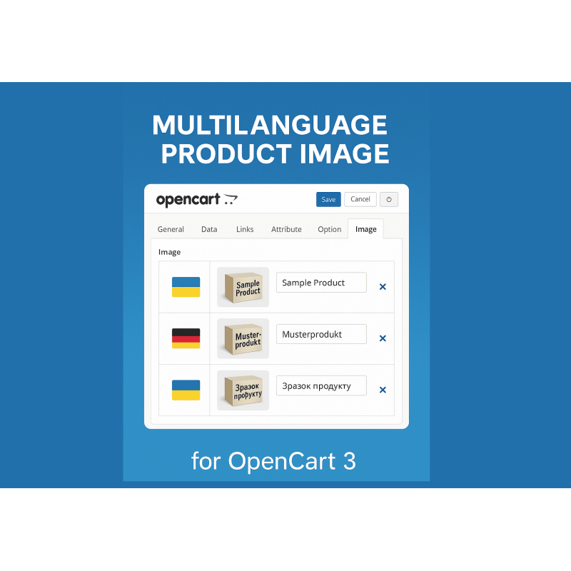 El módulo permite asignar imágenes de productos independientes para cada idioma de la tienda en OpenCart 3. Esto resulta especialmente útil para adaptar el contenido visual a cada mercado: cambiar textos de packaging, etiquetas, gráficos o elementos publicitarios en función del idioma del comprador.