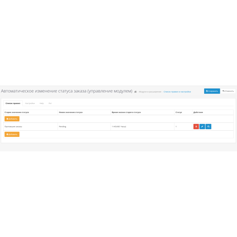 Модуль Автоматичне змінення статусу замовлення (управління модулем) дозволяє здійснити переведення статусу замовлення (Старий статус) в інший статус (Новий Статус) після певного періоду (вказується у днях або годинах). При цьому менеджеру магазину не потрібно пам'ятати про зміну статусів, або перевірку списку "старих" замовлень для виконання завдань щодо зміни статусу.
