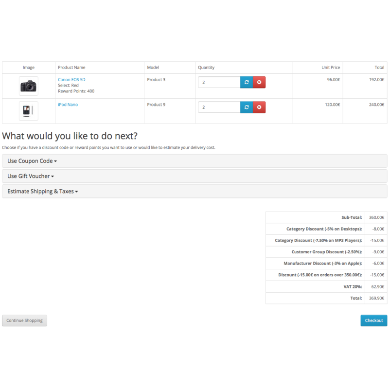 Налаштування знижок дуже просте та подібне до того, як ви налаштовуєте знижку на продукт або спеціальні пропозиції. Знижки можуть бути обмежені певною групою клієнтів і обмежені за часом датою початку та закінчення. Додатково є можливість встановити мінімальну кількість. Таким чином ви можете налаштувати знижки в такій формі: «Купуйте 5 товарів марки Y, щоб отримати знижку 15%» або «Купуйте 6 товарів категорії Z, щоб отримати знижку 10%» .