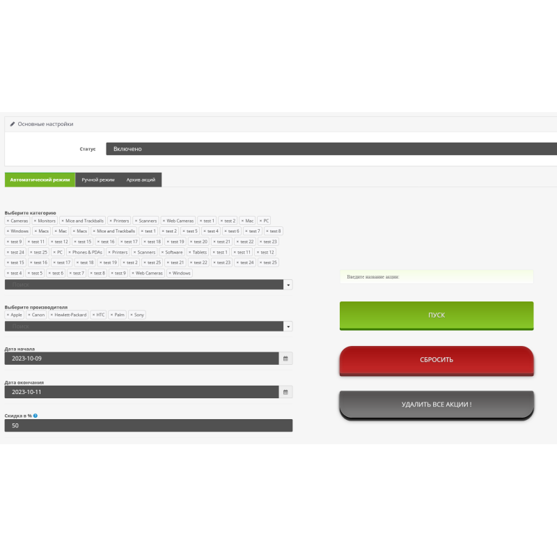 A adição automática de promoções é uma funcionalidade que permite adicionar automaticamente produtos promocionais ao seu site de loja online. Por exemplo, você pode especificar condições para aplicar um desconto a uma categoria específica de produtos ou a todos os produtos de um determinado fabricante.